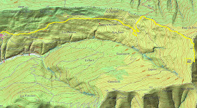 Casi desde los primeros metros podemos divisar la cima del Erata. En amarillo el itinerario de ascenso y en rojo el inicio del descenso.