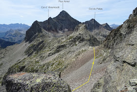En la foto el Palas visto desde el Pico Arriel. Señalo en amarillo el bucle que hicimos desde las inmediaciones del Lac de Palas. La línea arranca desde el Refugio d`Arremoulit.