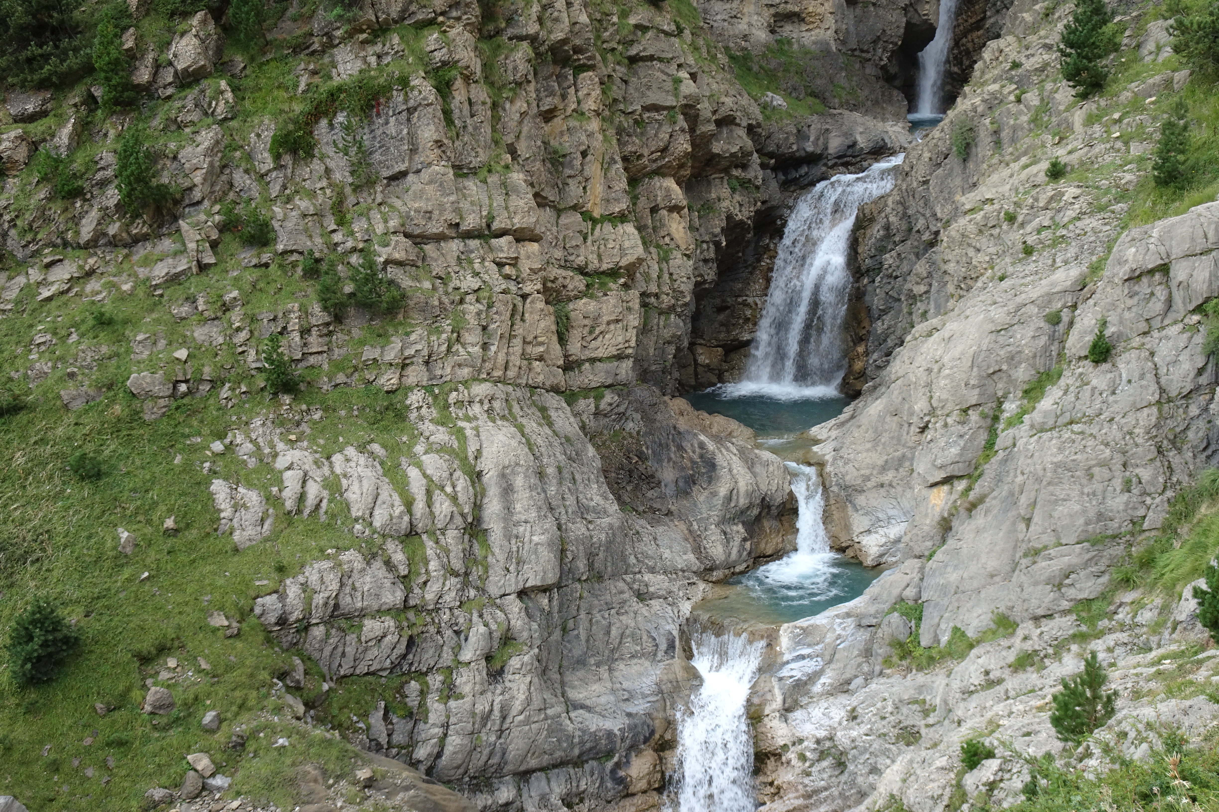 La cascada del Cinca recoge aguas del Glaciar de Monte Perdido y prácticamente cae en diversos tramos desde los 2.500 metros del Balcón de Pineta. Depende del caudal nos ofrece imágenes cambiantes. Este año se ven en la parte baja numerosos saltos y badinas.